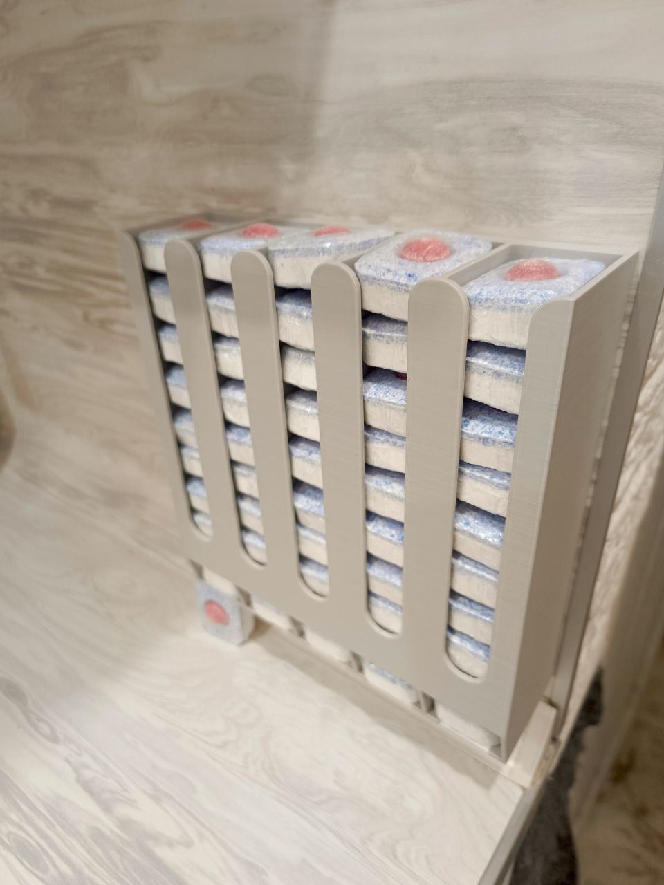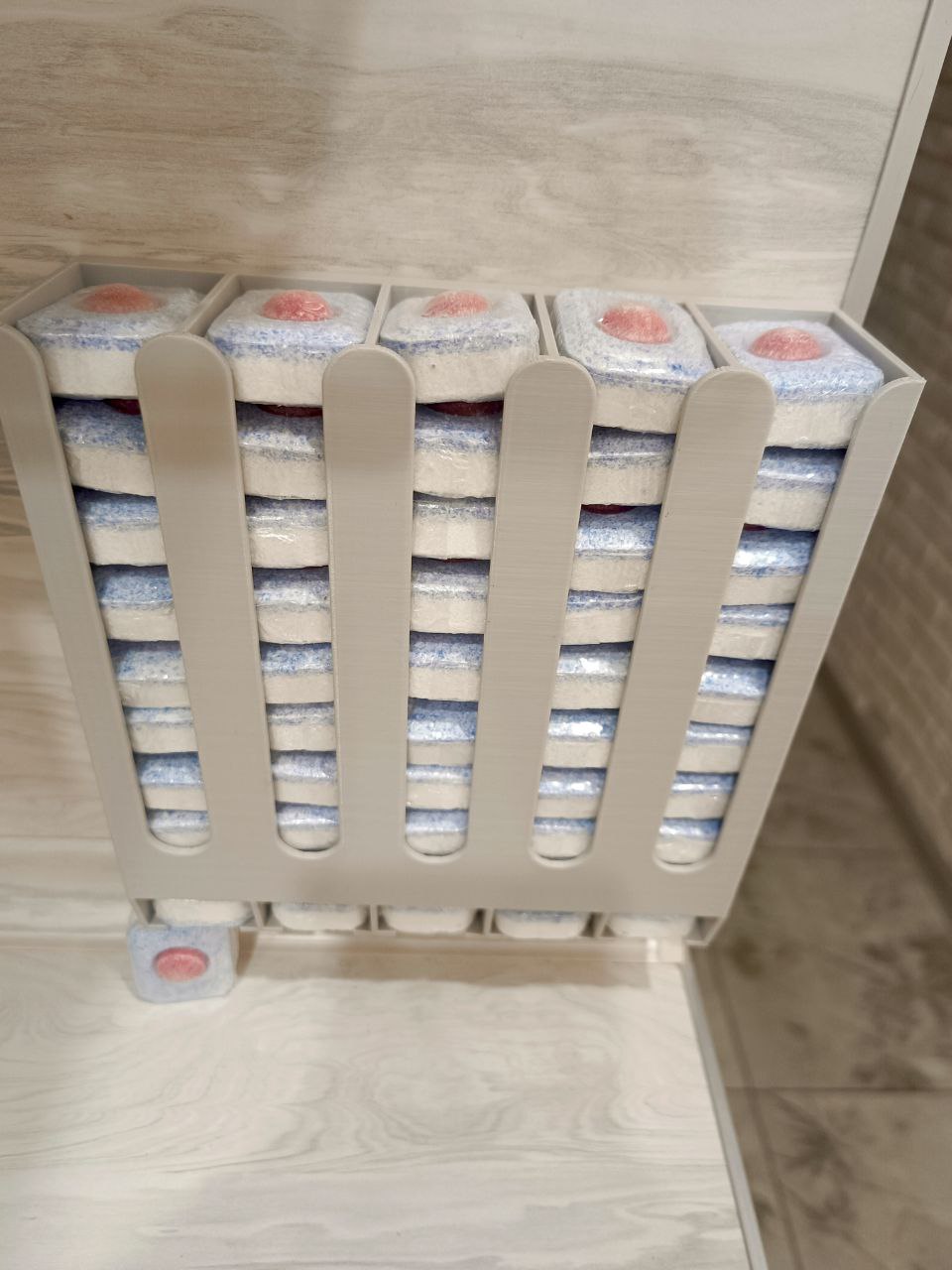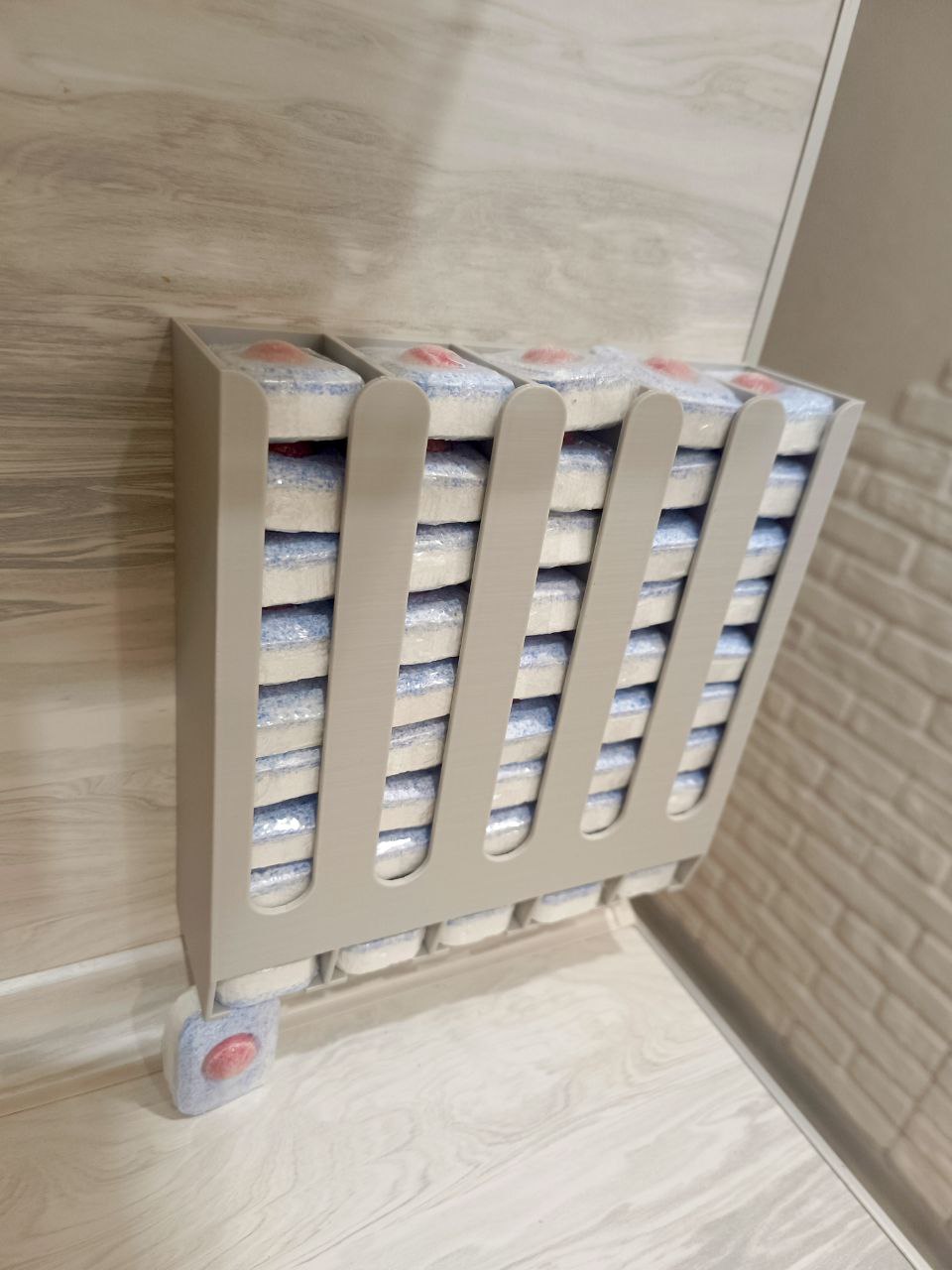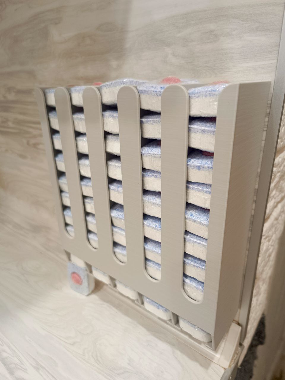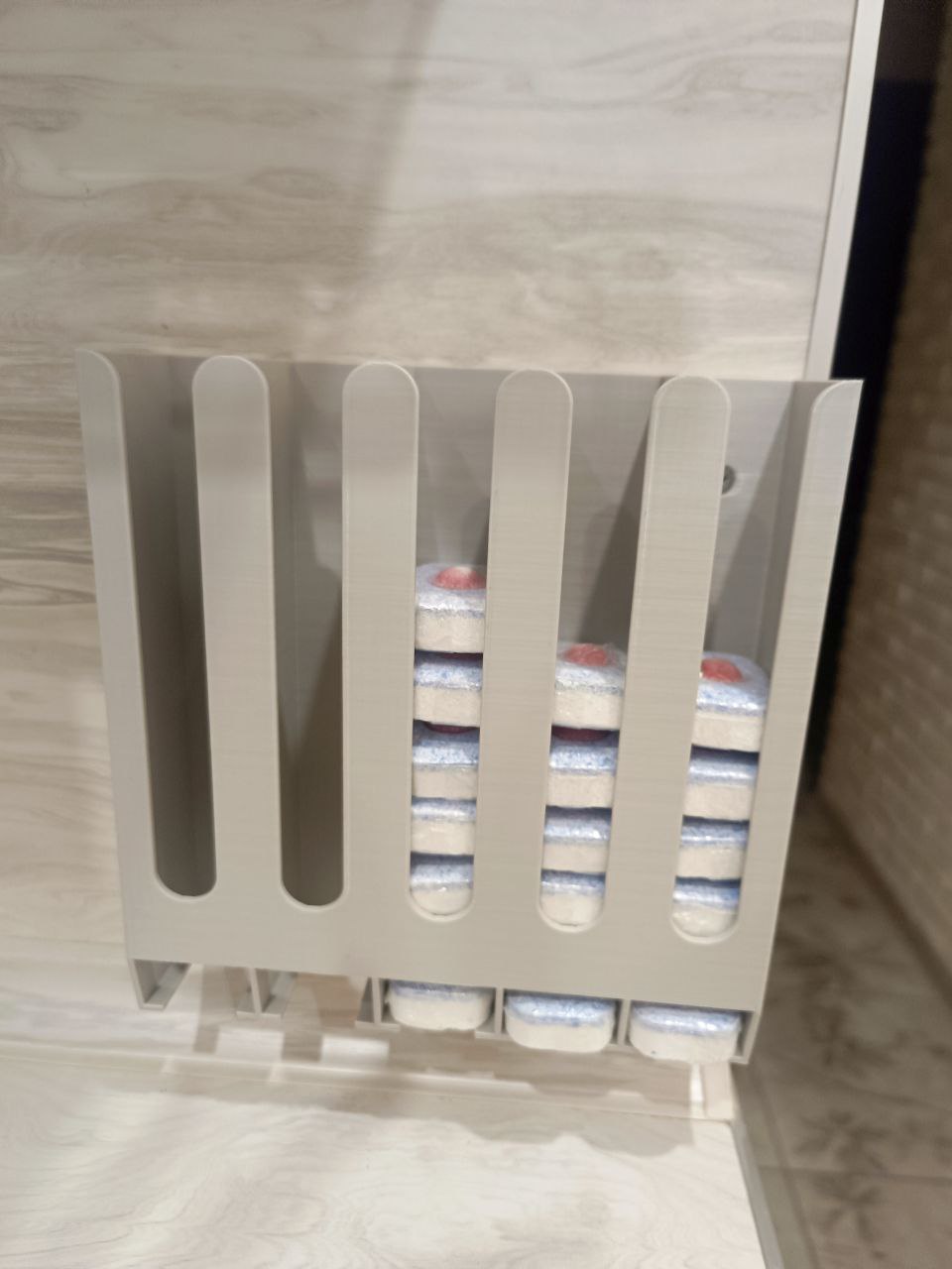 Простой и надежный диспенсер для таблеток обеспечивает удобное хранение таблеток для посудомоечной машины. Капсулы легко загружаются в диспансер. Компактный корпус идеально вписывается на дверцы кухонного гарнитура. Легко устанавливается и демонстрирует.